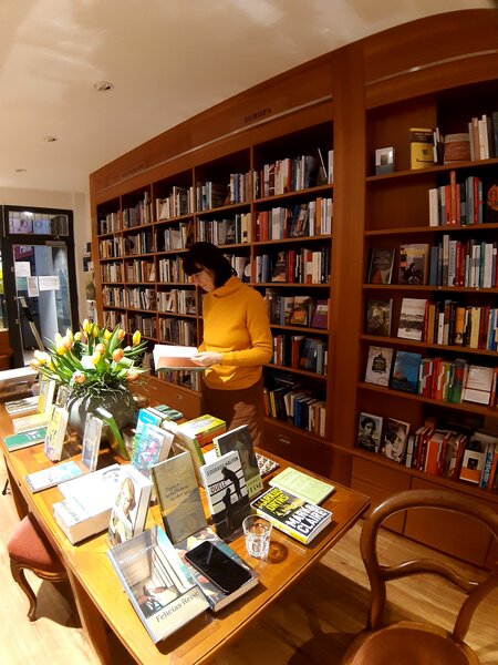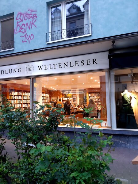 „Die Branche ist weiblich“ – so lautet das Motto der BücherFrauen. Wie wahr! In der Reihe „Frauen in der Frankfurter Literaturszene“, initiiert und moderiert von Bücherfrau und Übersetzerin Katharina Schmidt (links), werden zweimal im Jahr einige dieser interessanten Frauen ausführlich vorgestellt. Diesmal die Journalistin, Autorin und Stadtführerin Sabine Börchers (rechts). Die geborene Emderin kennt Frankfurt inzwischen besser als so manche Einheimische und hat u.a. das großartige Buch „101 Frankfurter Frauenorte“ im Societätsverlag veröffentlicht. Ein schöner Abend war das, im ebenso schönen Ambiente der Buchhandlung „Weltenleser“ mit der aufmerksamen Gastgeberin Maria Lucia Klöcker. Fortsetzung folgt!